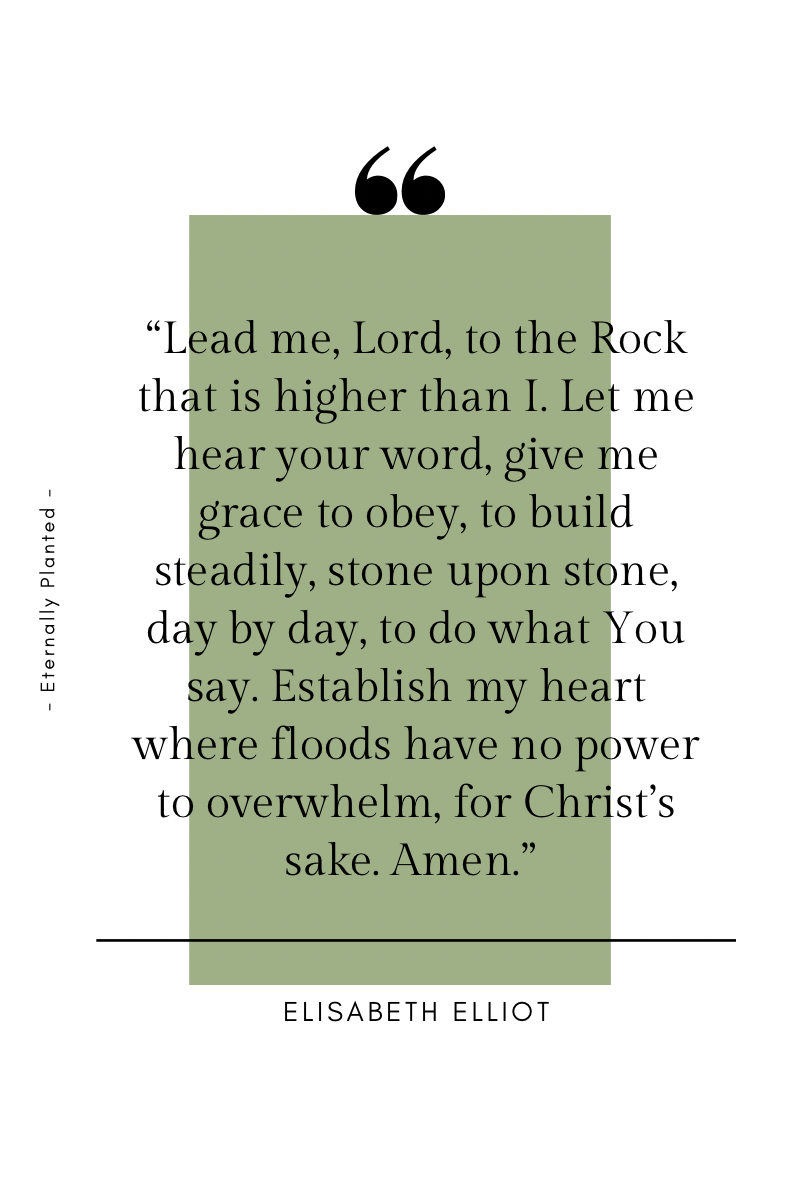 “Lead me, Lord, to the Rock that is higher than I. Let me hear your word, give me grace to obey, to build steadily, stone upon stone, day by day, to do what You say. Establish my heart where floods have no power to overwhelm, for Christ’s sake. Amen.” — Elisabeth Elliot