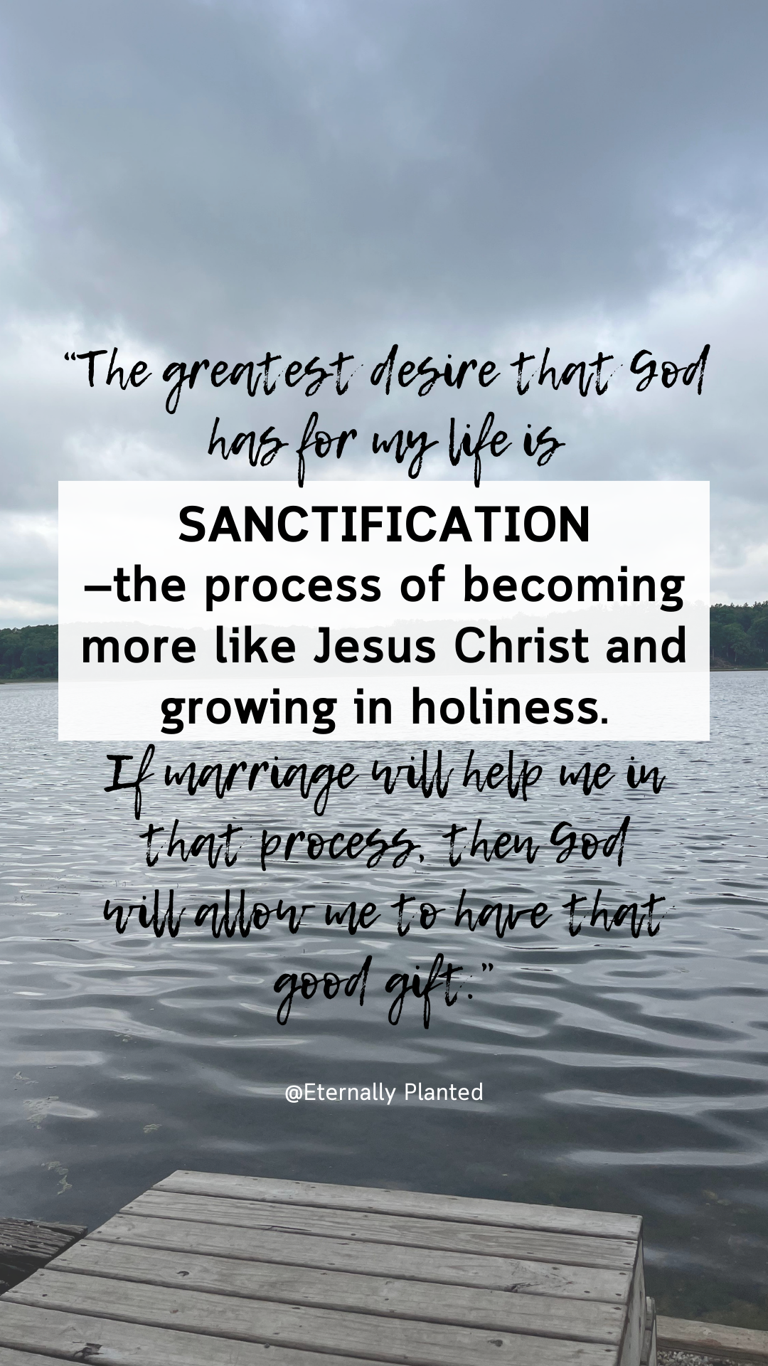The greatest desire that God has for my life is sanctification—the process of becoming more like Jesus Christ and growing in holiness. If marriage will help me in that process, then God will allow me to have that good gift.