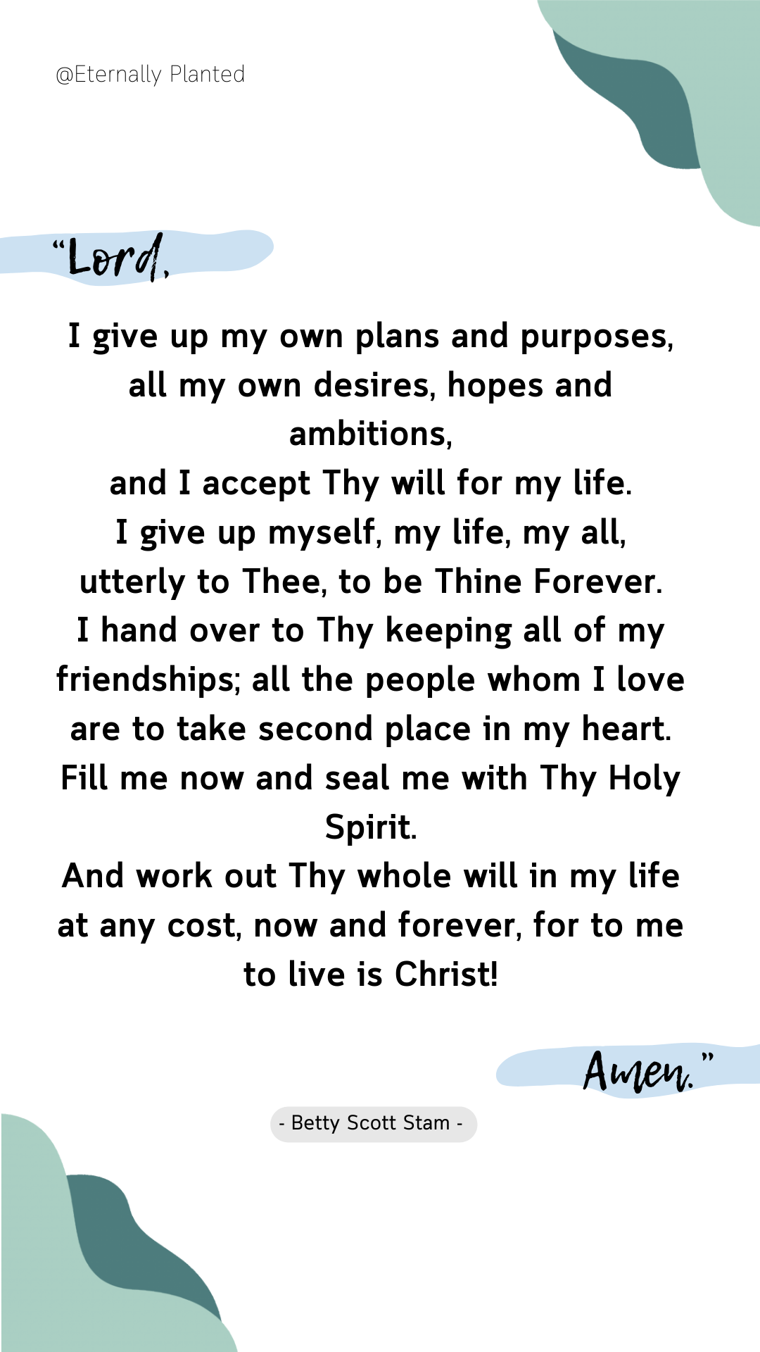 Lord, I give up my own plans and purposes, all my own desires, hopes and ambitions, and I accept Thy will for my life. I give up myself, my life, my all, utterly to Thee, to be Thine Forever. I hand over to Thy keeping all of my friendships; all the people whom I love are to take second place in my heart. Fill me now and seal me with Thy Holy Spirit. And work out Thy whole will in my life at any cost, [both] now and forever, for to me to live is Christ! Amen!